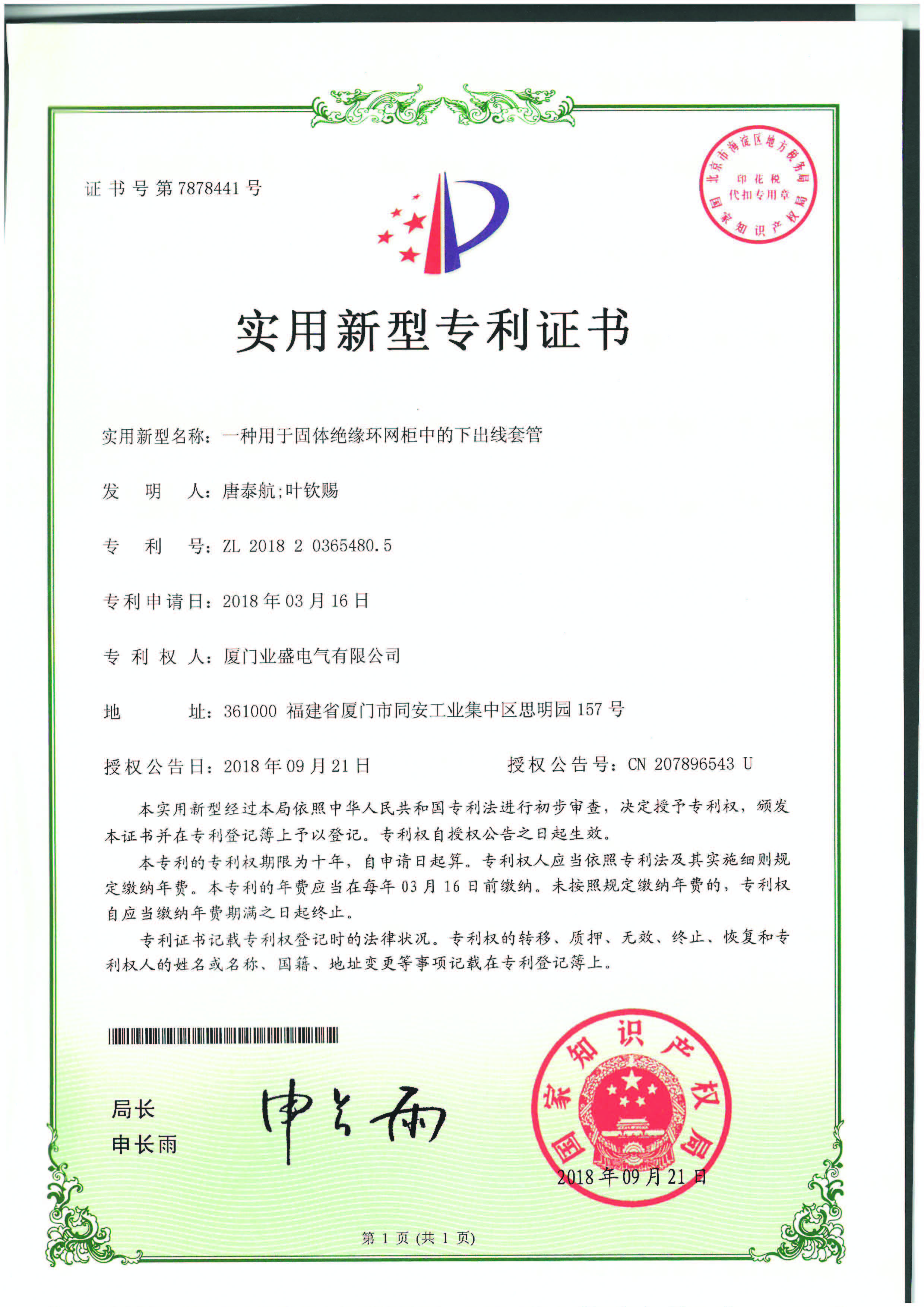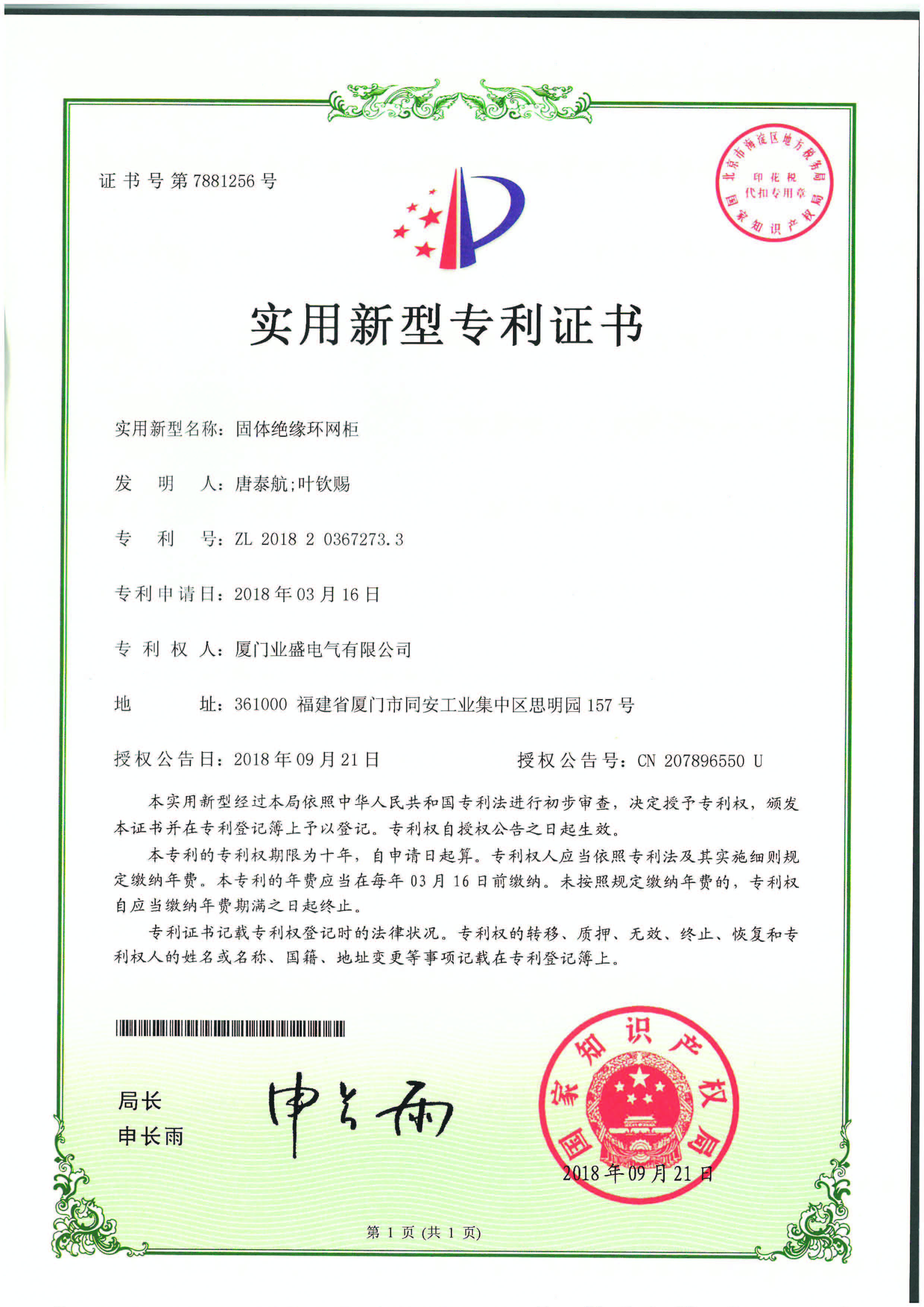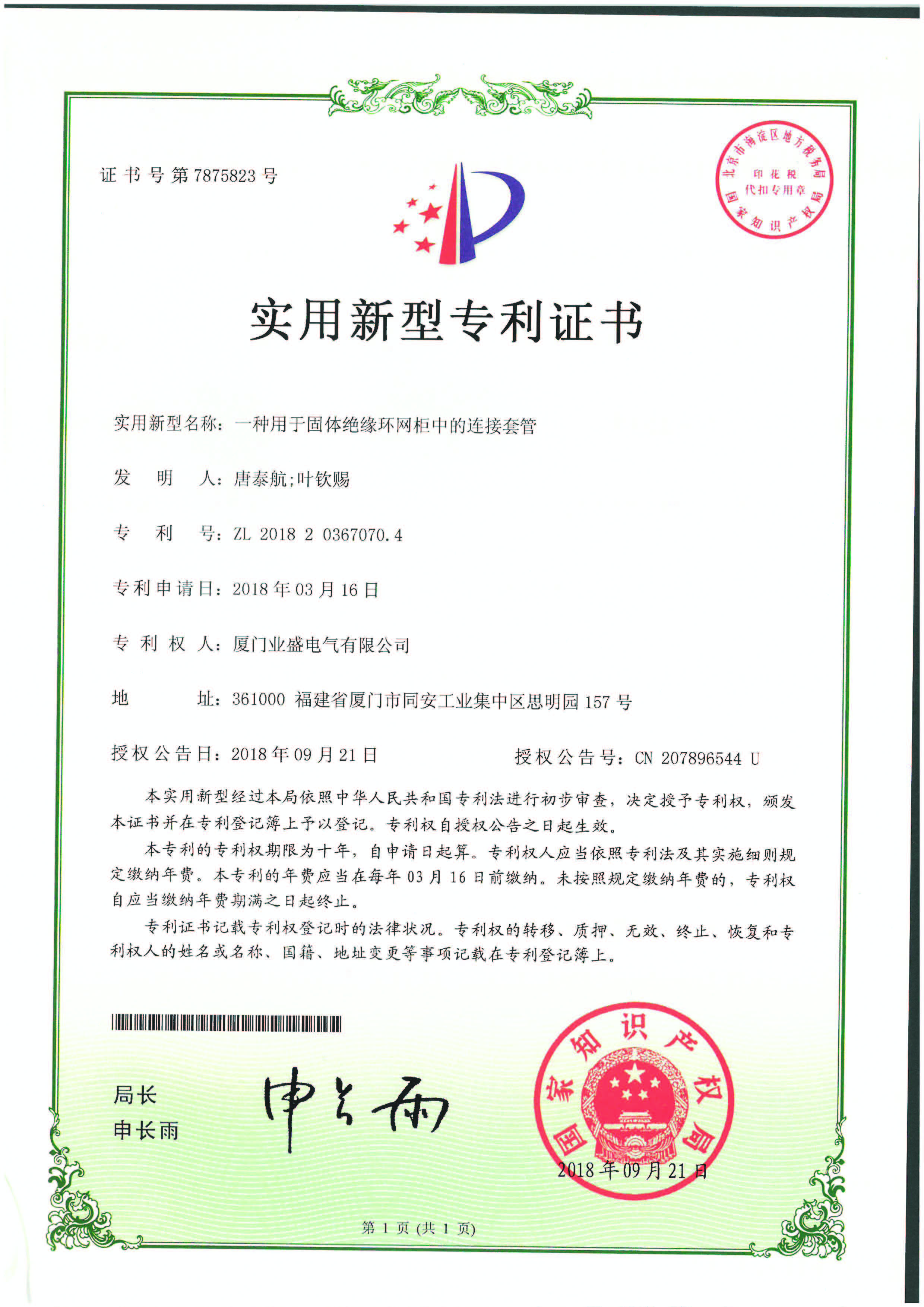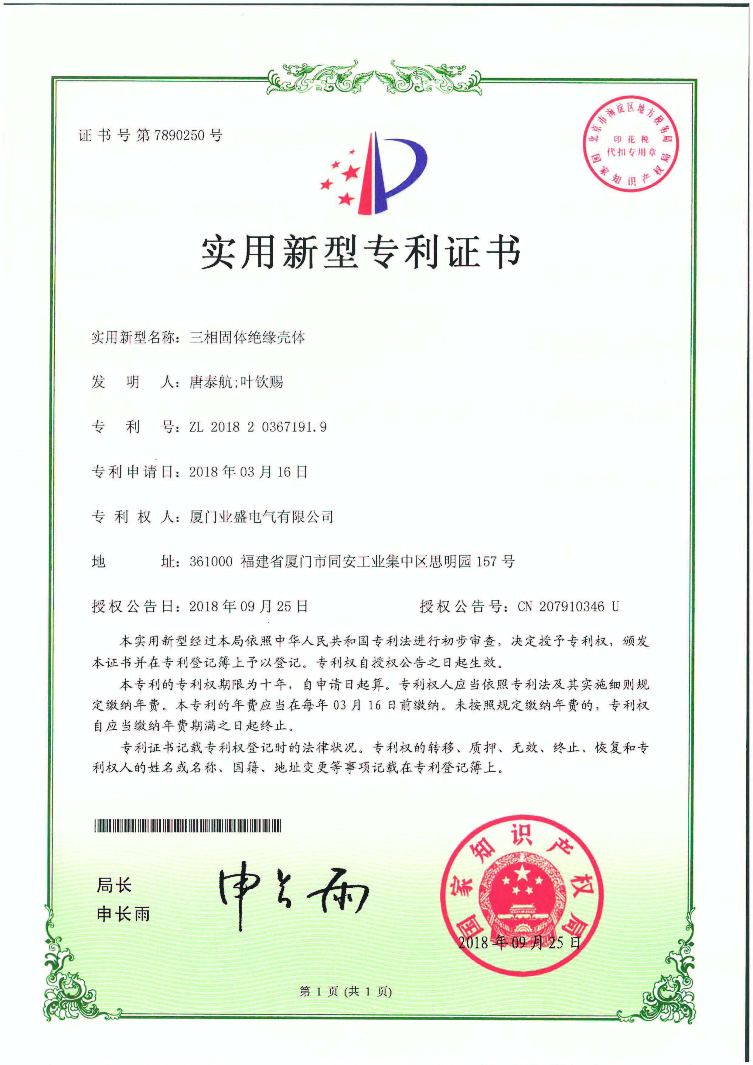 實(shí)用新型專利證書