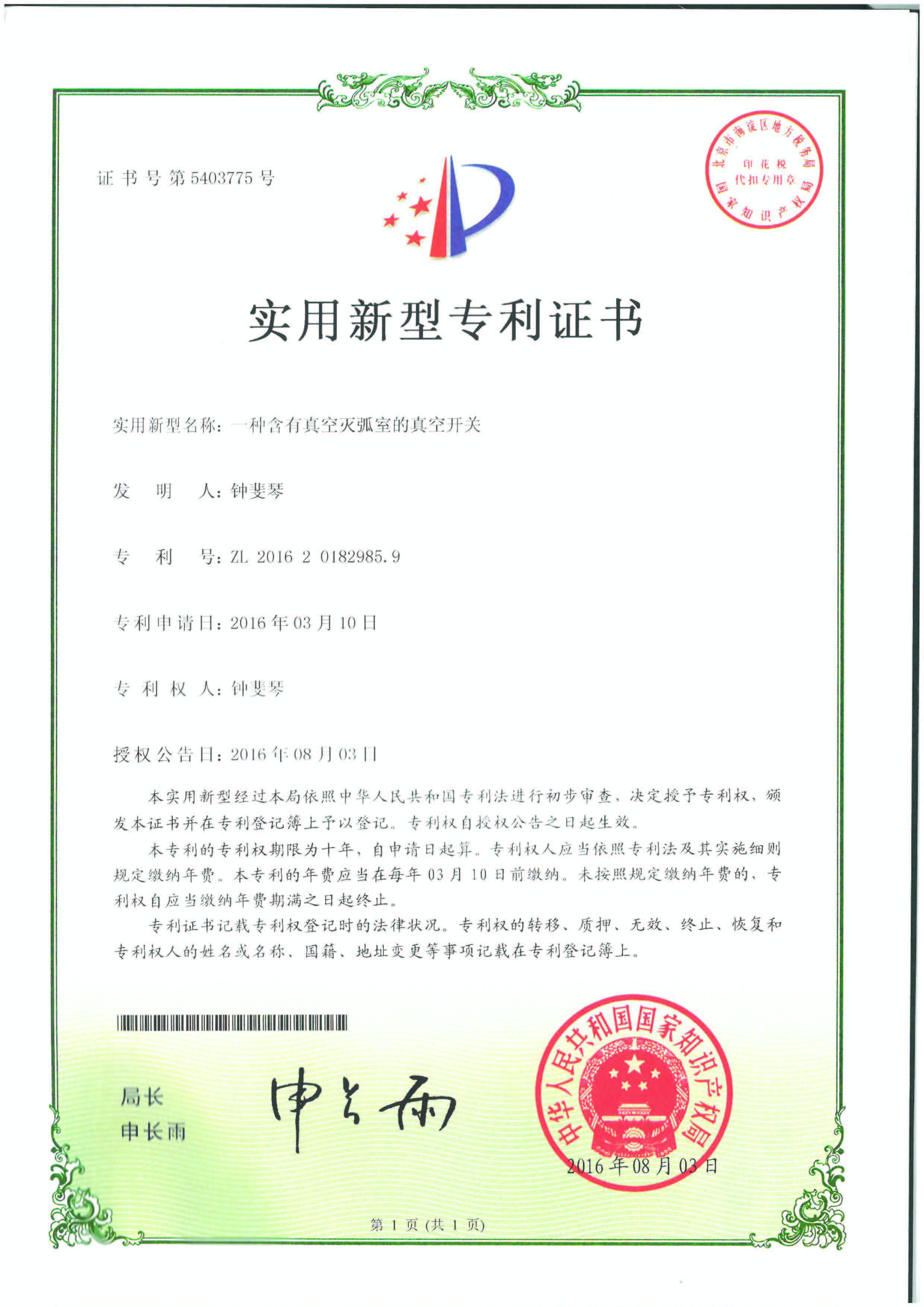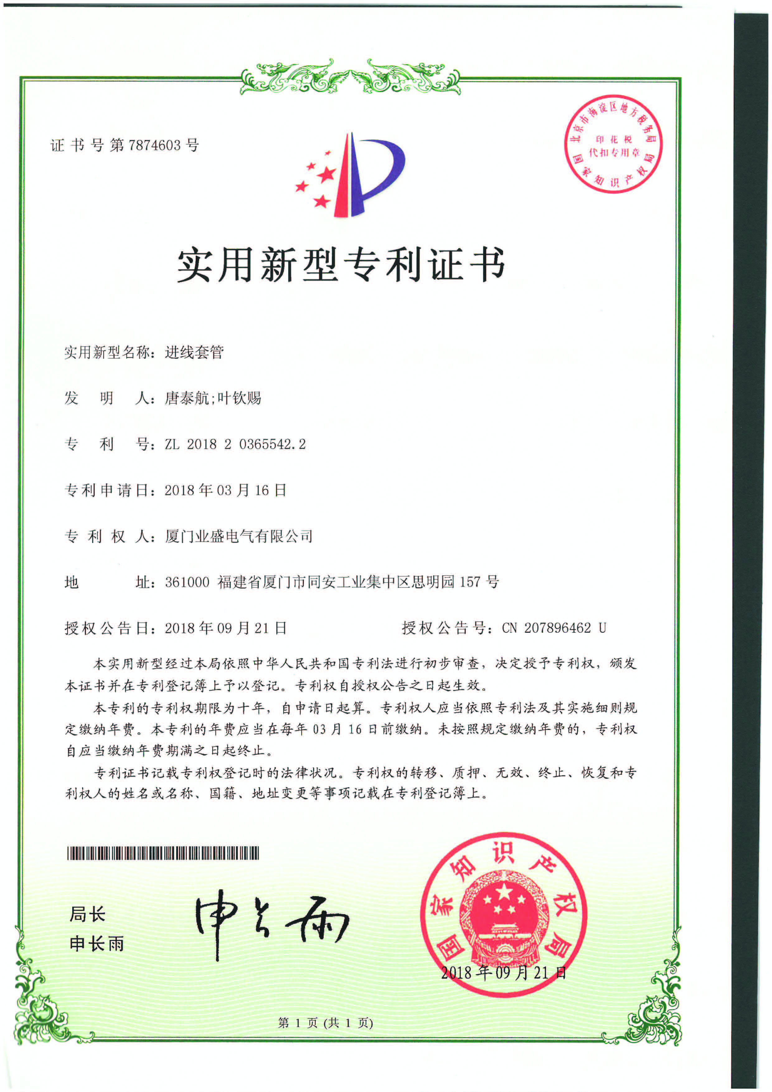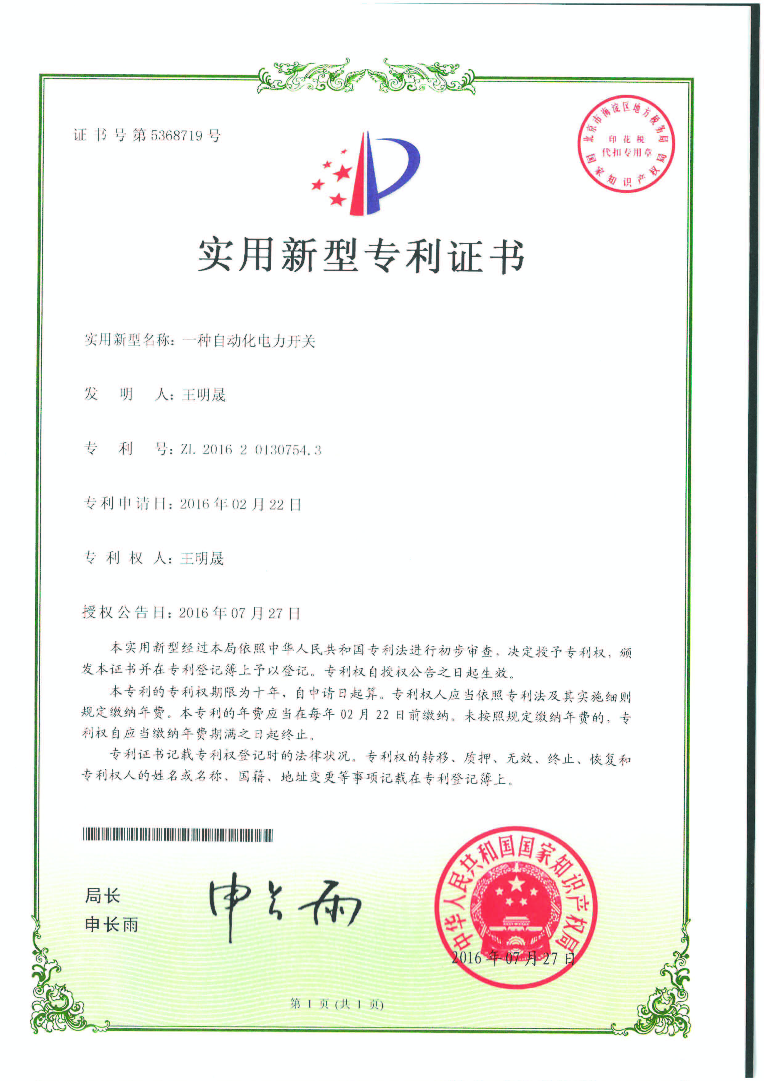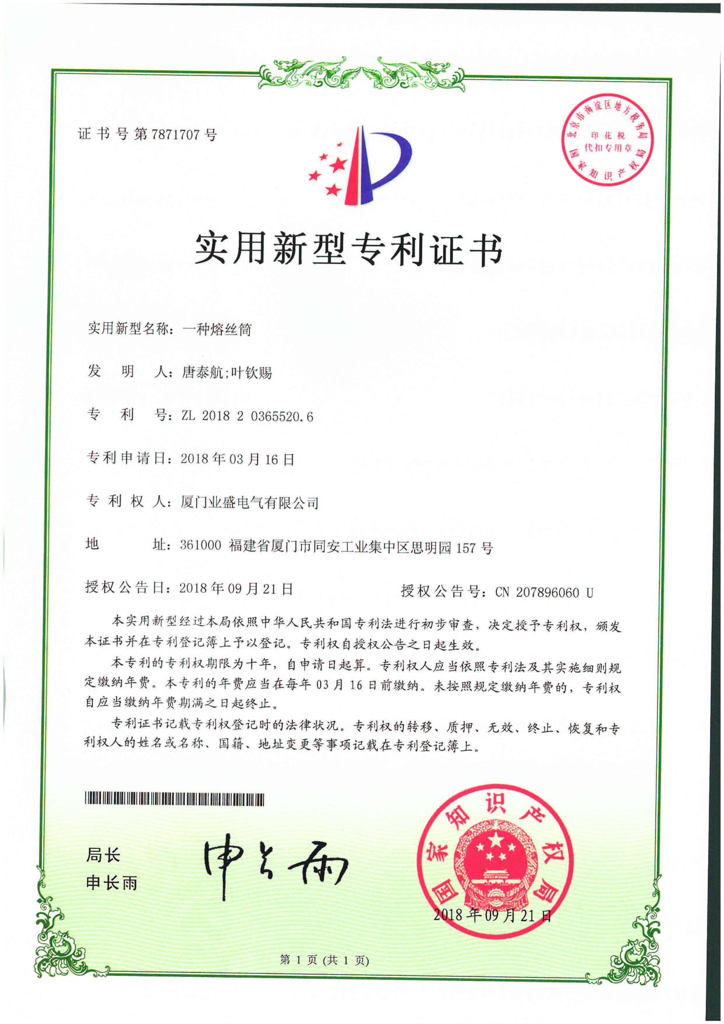 實(shí)用新型專利證書